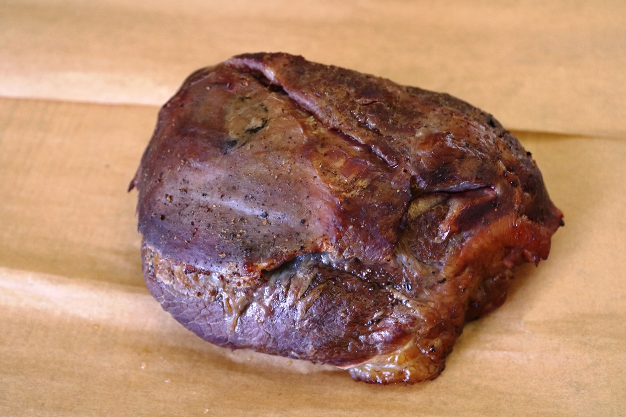 9.5 שעות עישון – 95 מעלות (יכול להיות שהיה יותר וכבר התחיל לרדת) הבשר רך, המון ג'לטין מסביב, מעט מלוח מידי אבל טעים ומזכיר את מה שטעמתי.