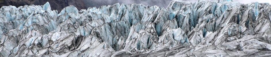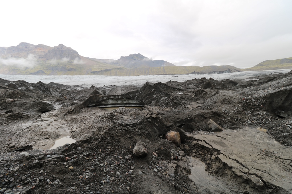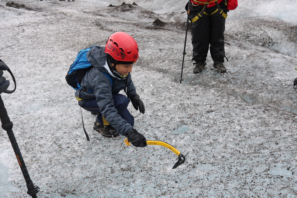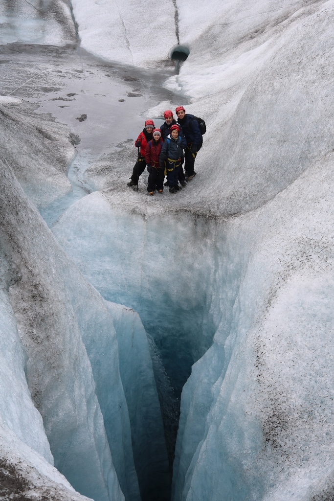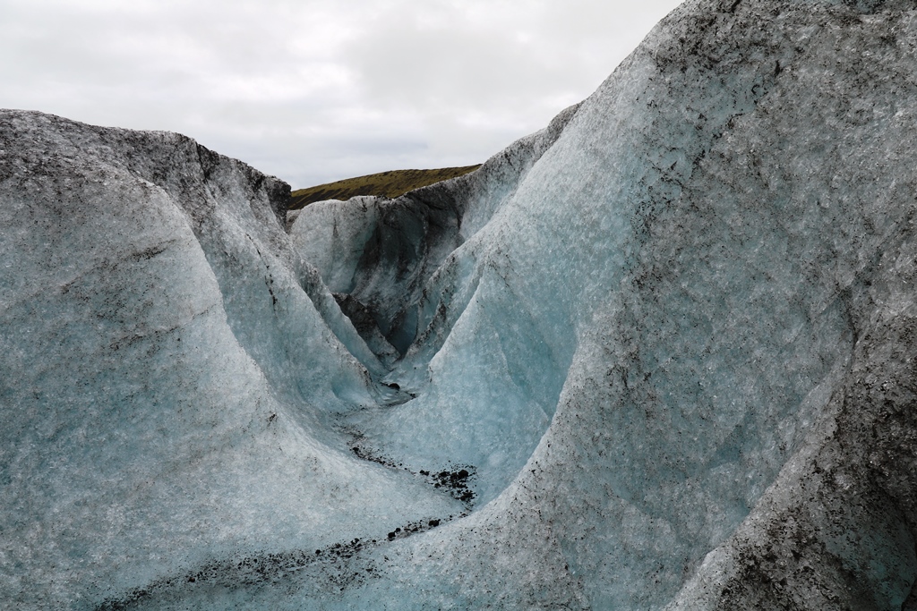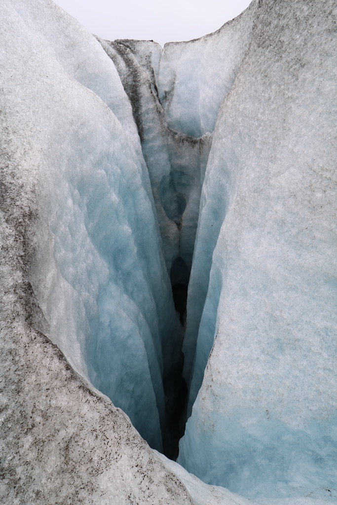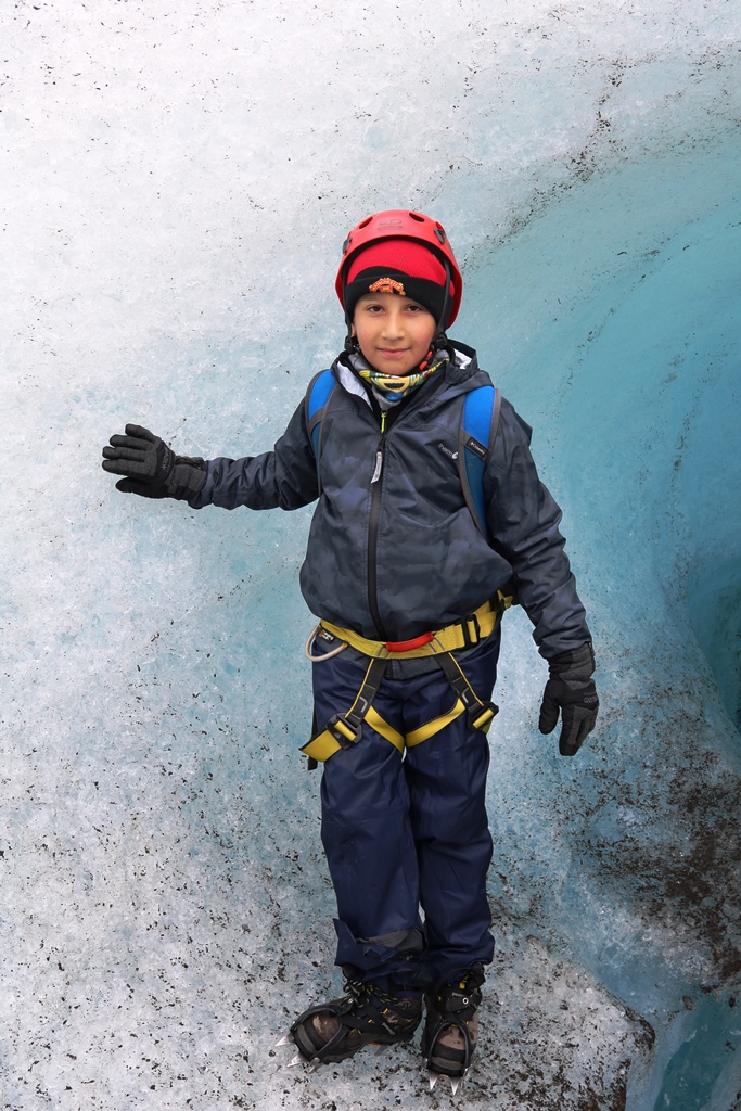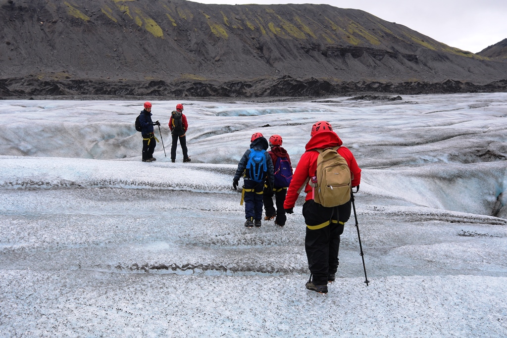 הצטיידנו ברתמה, קסדה, קרמפונים ומקלות הליכה (למי שרצה) ויצאנו בגשם ובקור לכיוון הקרחון. התחזית טענה שאין גשם, אבל כשהתחלנו ללכת היה מעונן ורטוב והיה חשש יותר מסביר שהמזל שהאיר לנו פנים עד כה באיסלנד עלול לנטוש אותנו. אבל די מהר העננים התפזרו והשמש חזרה להאיר וכל השעות הבאות היו שילוב מושלם של קרח לבן אפור ושחור ושמיים כחולים מלמעלה. ההגעה לקרחון עוברת לצידו של האגם שהוא תוצאה של הפשרת הקרחון. תחילה מגיעים לאזור של קרח הספוג כולו באפר געשי ועל כן הוא שחור לגמרי ונראה כמו הרים כהים וקודרים. בשלב הזה שמנו את הקרמפונים על הנעליים וההליכה הקשה עד כה הפכה לקלה באופן מפתיע, כיוון שהקרמפונים נאחזים בקרקע ומונעים כמעט לחלוטין את הסיכוי להחליק. בהדרגה הגענו לאזור הלבן של הקרחון – תחושה של ארץ אגדות בלתי מציאותית.