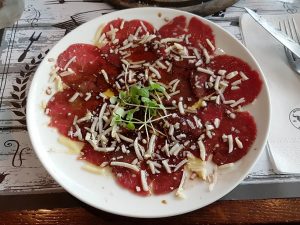 הילה שאכלה ארוחת בוקר גדולה הזמינה קרפצ'יו בקר ולחם הבית.