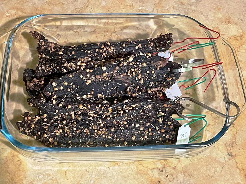 הטמפרטורה בארון הייתה בסביבות 21 מעלות, הלחות כ-67% שזה קצת יותר מהמומלץ (55-60%) אבל עדיין בסדר ולא בטווח שעלול לסכן את הבשר. איבוד המשקל היה כ-17% מהמשקל ההתחלתי בכל יום, כך שאחרי 3 ימים הגעתי ליעד של חצי מהמשקל המקורי. יש המעדיפים בילטונג יבש יותר.
