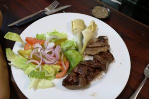 כל אחד קיבל צלחת גדולה עם סלט טרי. לבשר נלווה צ'ימיצ'ורי כמו שהוא אמור להיות (עם שום ובלי צ'ילי). בשביל הסלט היה רוטב וינגרט-נענע טעים ויש אפשרות לג'בטה עם רוצים, אבל אין תוספות של אורז צ'יפס וכד'. חצאי ארטישוקים על הפלאנצ'ה דווקא יש.