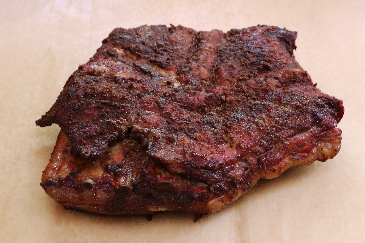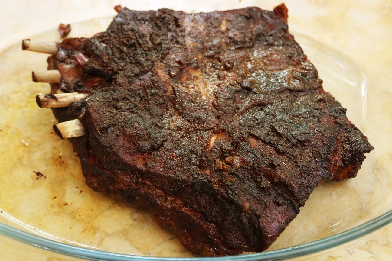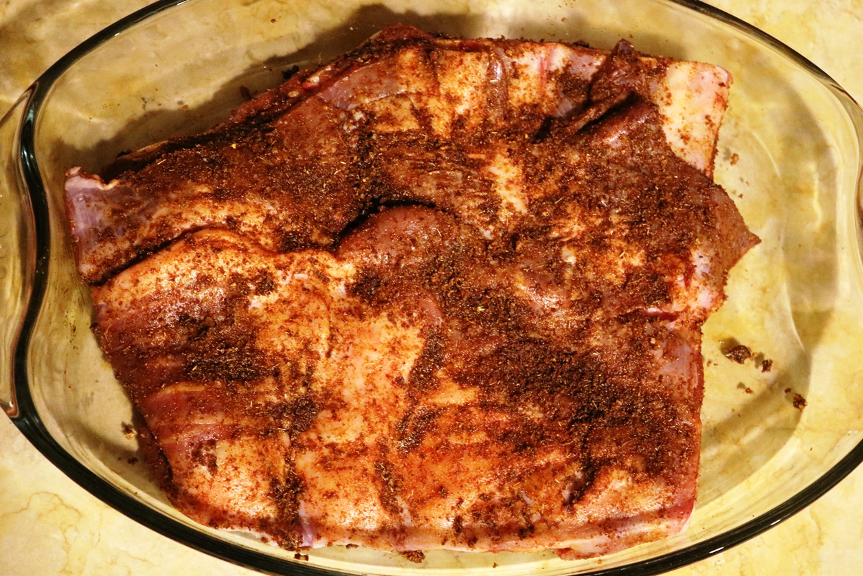 הפשרתי מראש חצי חזה טלה גדול (חזה שלם של 2.750 ק"ג) – בגודל הזה יש מצב שזה כבר על גבול הכבש ובעצם מצדיק קיצוב אחר שבו יש הפרדה מראש בין הצלעות לבין הבטן עצמה. מכיוון שהעצמות ממילא היו קצרות מאוד והרוב היה בטן, הנחתי שטיפול אחיד וארוך יחסית בכל הנתח יהיה בסדר.