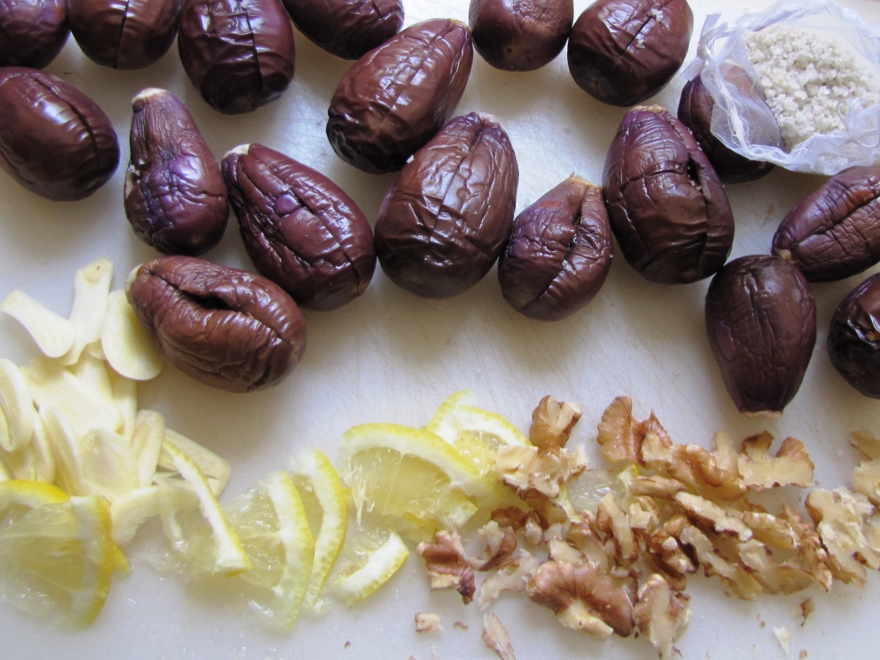 מצרכים: חצילונים, שום, לימון, פקאנים, מלח גס, שמן זית