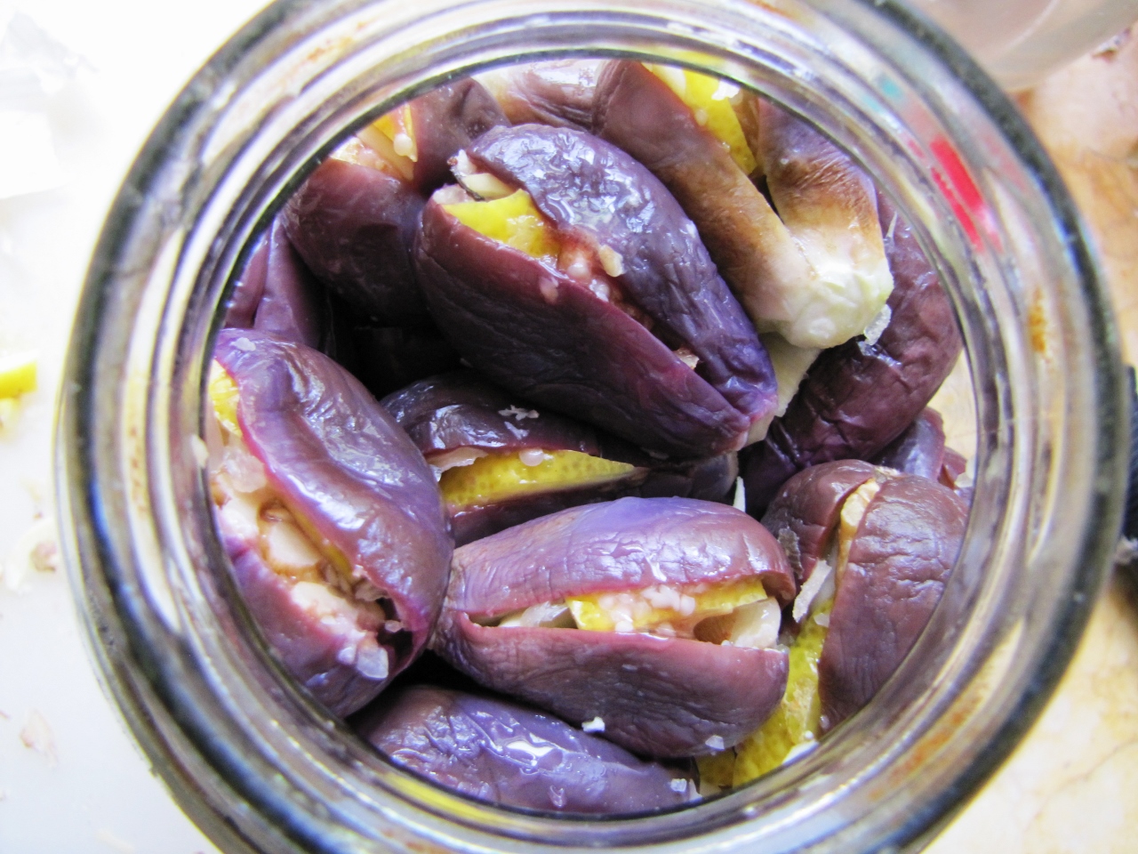 אפשר לעשות מהם ריבה כמנהג המרוקאים ולאחסון אותה עד למימונה הבאה, ואפשר גם להחמיץ אותם בשלל דרכים שונות. פתחתי את אחד מספרי הבישול האהובים עלי ודפדפתי למתכון שאני אוהב – חצילים משומרים בשמן (מצטער, דיאטטי זה לא!)