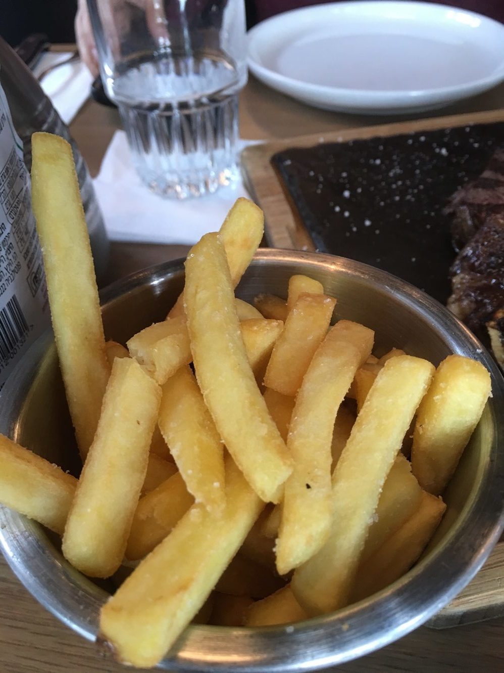 ביקשתי המשך טיפול בחלקים היותר נאים של האנטריקוט ונשאלתי "האם להעלות מידת עשייה או רק לצרוב קלות?" המשפט הזה מתמצת את רמת המקצעיות וההבנה של המלצריות והוא עומד בניגוד מופלא לדו-שיח שקיימתי עם מלצרית במסעדת בשר נחשבת אחרת שבה שאלתי לגבי נתח קצבים, האם מדובר בנתח דק ("סקירט", "רוטפלייש") או עבה ("אונגלה") ונעניתי ב"לא ידעתי שיש יותר מסוג אחד – אני אשאל במטבח" (האמת שיש עוד כמה "נתחי קצבים" אבל שני אלה הם המוכרים יותר ומגיעים מהסרעפת).