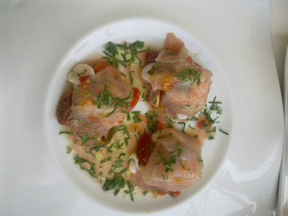 בצלחת שלי קרפאצ'ו יולטייל עוטף פרוסות שרימפס וקלמארי, הרוטב מעט חריף אבל לא באופן מוגזם.