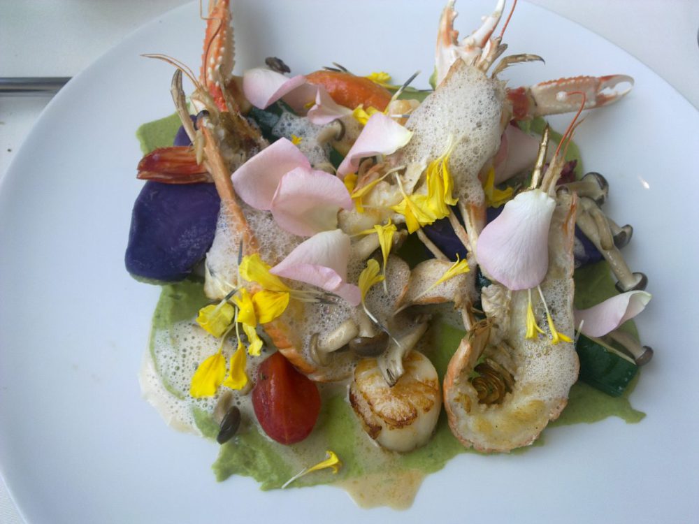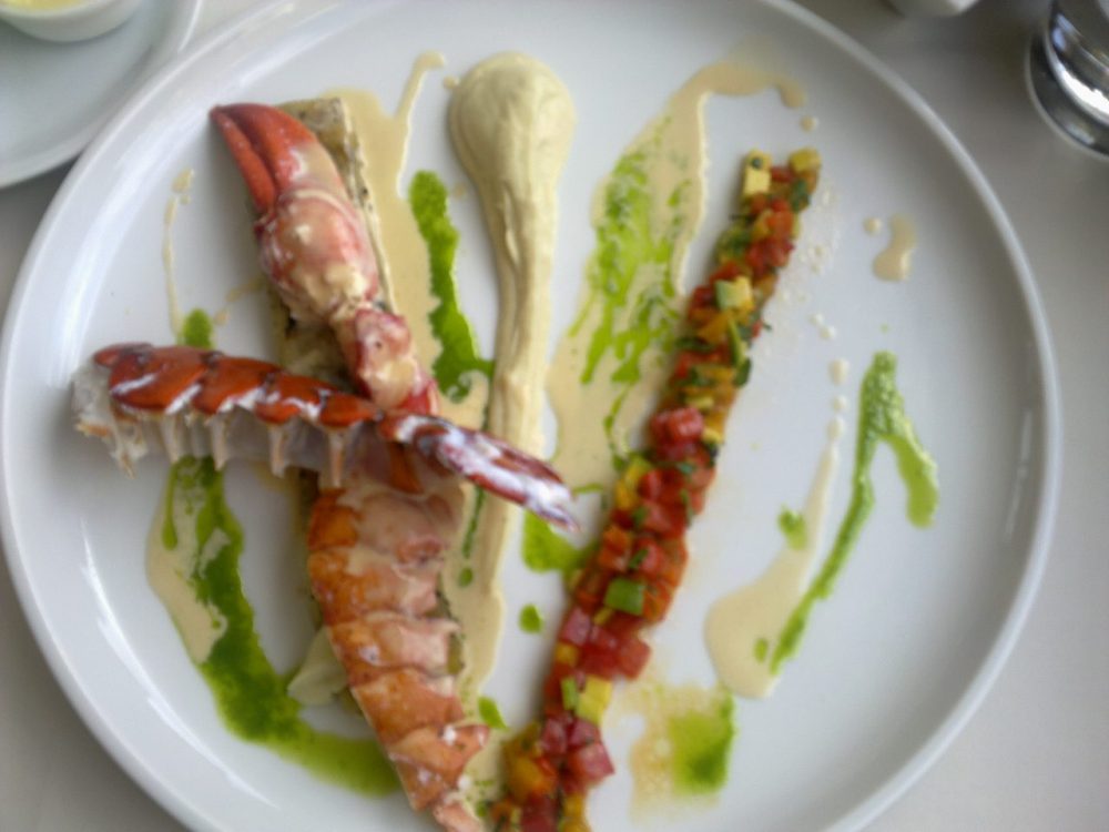 גם המנה שלי מעוצבת בטוב טעם, אבל הטעם גן-עדן אמיתי, חצי לובסטר מבושל בוואקום על גראטן תפוחי אדמה עם רטבים, קרמים, שמן, ירקות וכו'.