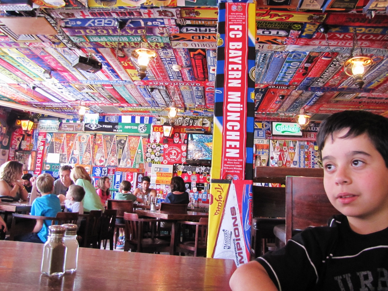 מכיוון שכבר הגיעה שעת צהריים והאופק הקולינרי מצטמצם ככל כשמדרימים החלטנו לסעוד בערד לפני שנדרים יותר מדי. בחיפושי אחרי בירה שאני אוהב כבר פקדתי מספר ארצות אבל בפאב של היישוב שבו גדלתי לא ביקרתי מעולם. מוזה זכתה בתואר בר הבירה הטוב ביותר באזור הדרום לשנת 2011 והשמועות אומרות שהאוכל שם לא רע, אז החלטנו לבדוק. המקום גדול ויפה ומתהדר באוסף צעיפי ודגלי כדורגל מכל העולם, המכסים את הקירות והתקרה. IMG_2574S (1280x960)מכיוון שהמקום פתוח כל ימות השבוע היה ברור שכשר הוא לא יהיה, אבל לא ידענו אם בגלל הפסח ניענש בניסיונות כושלים להכין לחמניות "כשרות". לשמחתו זיהינו די מהר פיתות על השולחן לידנו ונרגענו.