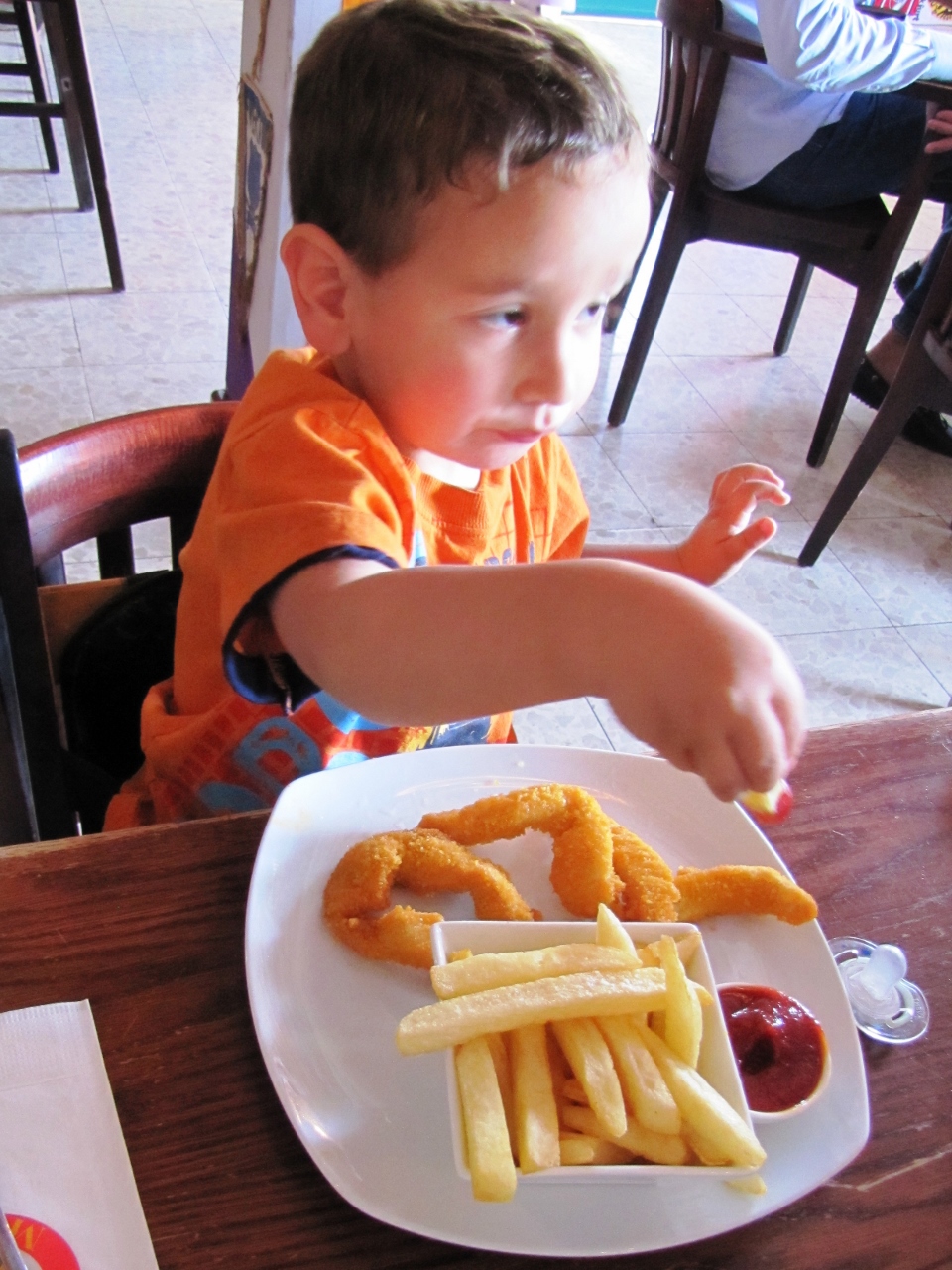 הזמנו 2 המבורגרים, כריך רוסטביף וסלט עוף, ולזאטוט מנת שניצלונים עם צ'יפס.