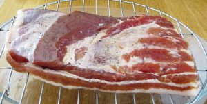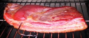 הכנסתי למעשנה את הבייקון שסיים את תהליך הכבישה והייבוש (הפעם רק כף מלח על רבע כוס סוכר).