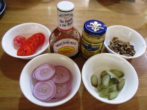 מלפפונים חמוצים, חרדל דיזון ורוטב ברביקיו יש דרך קבע במקרר.
