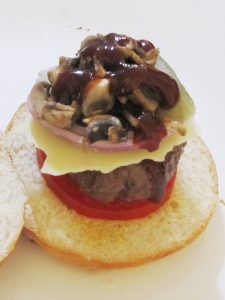 מיניבורגרים מ"הבשר של ניר" ולחמניות קטנות, גבינה צהובה טובה, בצל סגול, עגבניות תמר ופטריות.