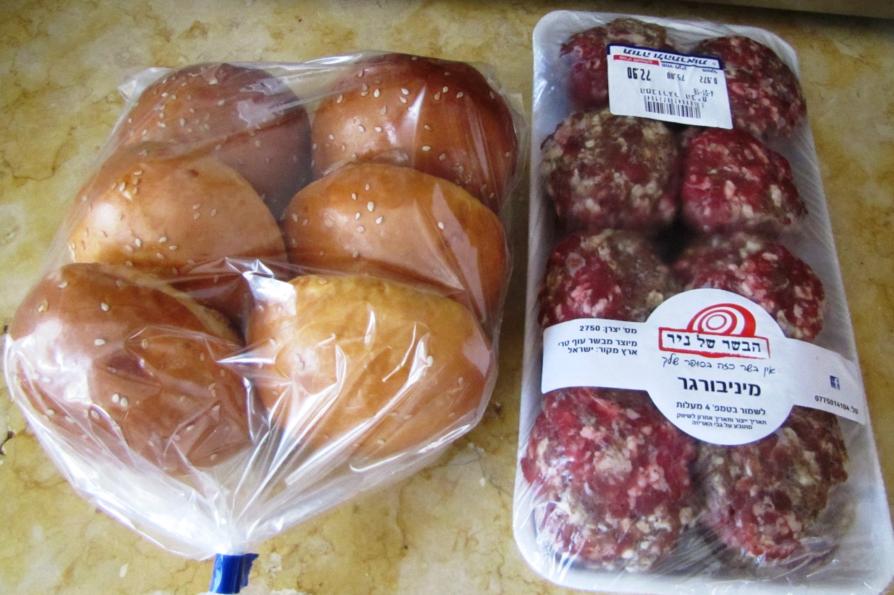 מיניבורגרים מ"הבשר של ניר" ולחמניות קטנות, גבינה צהובה טובה, בצל סגול, עגבניות תמר ופטריות.