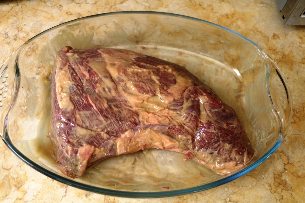 הכנתי בבוקר שוט אספרסו טעים, ערבבתי אותו עם כף חרדל דיז'ון חלק, מרחתי היטב את הנתח משני הצדדים והחזרתי למקרר למשך כחצי שעה.