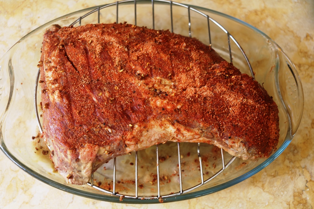 מלח דק, פפריקה, שום גרוס ופלפל ס'צואן – (כתשתי במכתש ועלי), עיסיתי היטב את הנתח, הנחתי על רשת והחזרתי למקרר עד למועד העישון.
