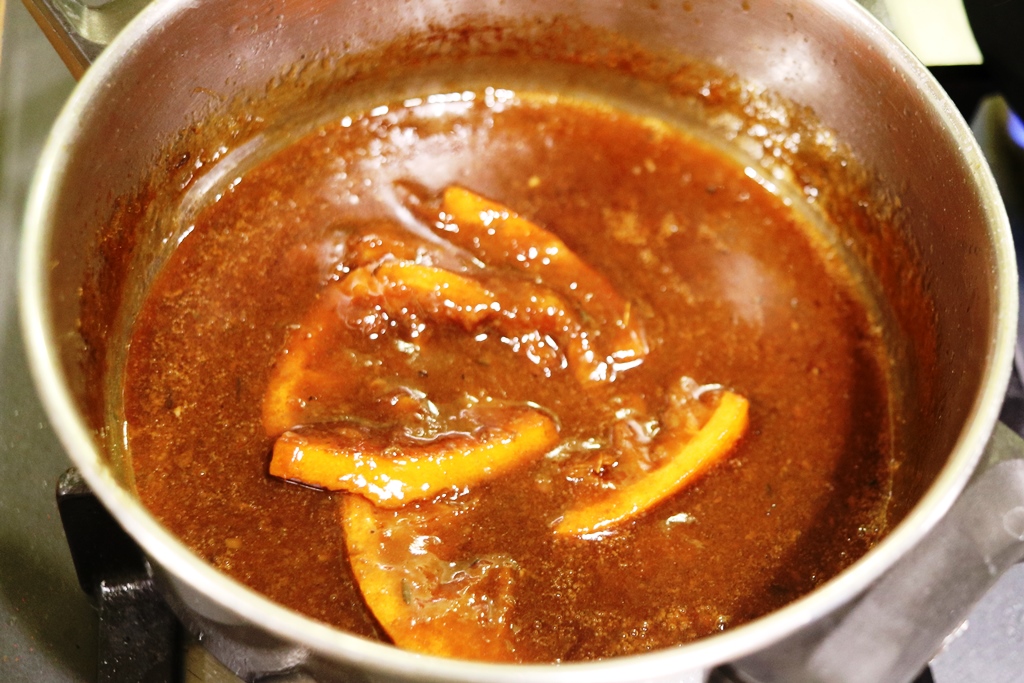 לסיר הוספתי כף רוטב סויה, כף סילאן, חצי תפוז מתוק חתוך לפרוסות ופלפל שחור גרוס ובישלתי על אש קטנה עד שהנוזל הצטמצם לכדי סירופ.