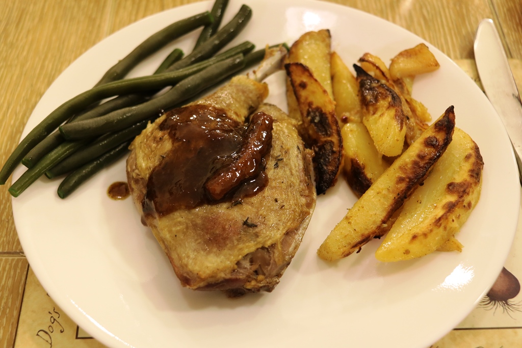 מזגתי מהרוטב מעל, הוספתי תפוחי אדמה בתנור ושעועית ירוקה וקדימה לארוחה.
