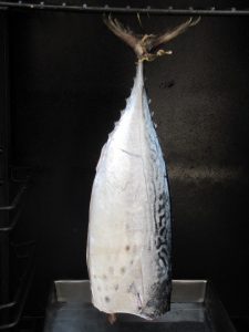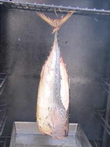 למחרת הדלקתי את המעשנה לטמפרטורה של 90-100 מעלות ותליתי את הדג – יש לו אחלה זנב לקשירה.