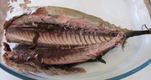 כשפתחתי את הדג ממש לחצי גיליתי אידרה כפולה. בהתחלה חשבתי שאולי זה אופייני לדג הזה אבל התברר שזכיתי בדג מיוחד, אמנם לא דג מדבר ומגשים משאלות (טוב, בלי ראש זה קצת קשה) וגם לא מפיק מטבעות זהב, אבל בהחלט דג יוצא דופן.