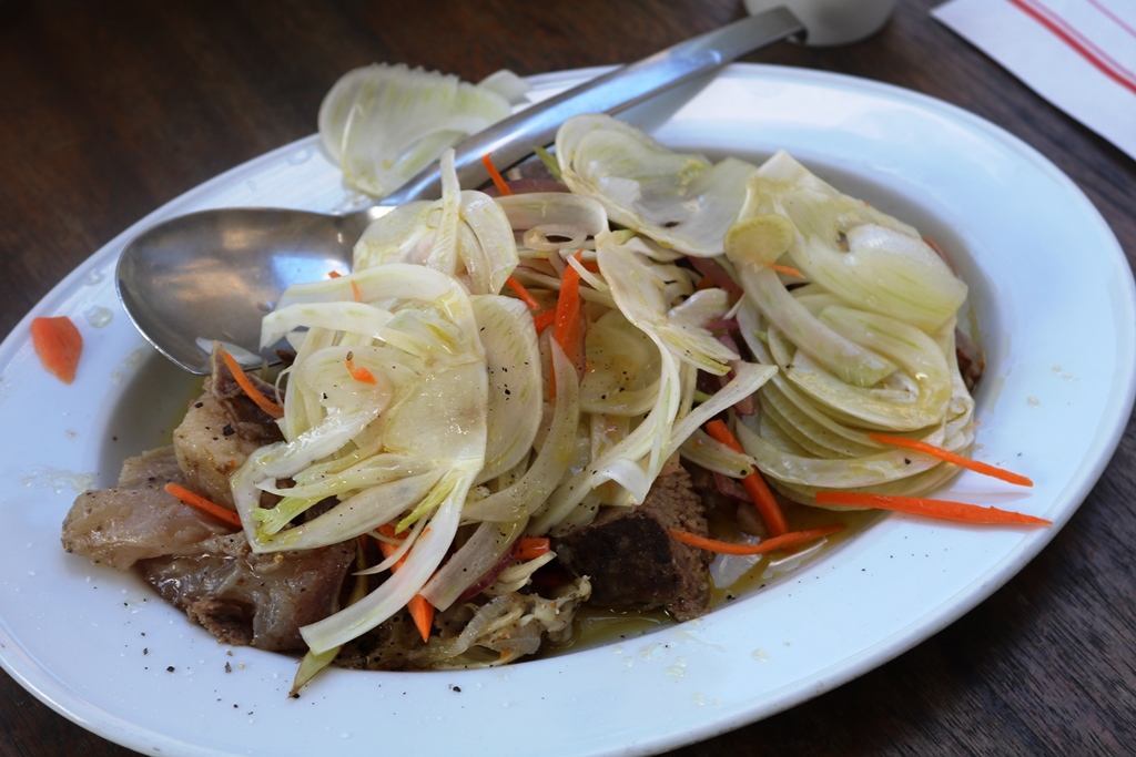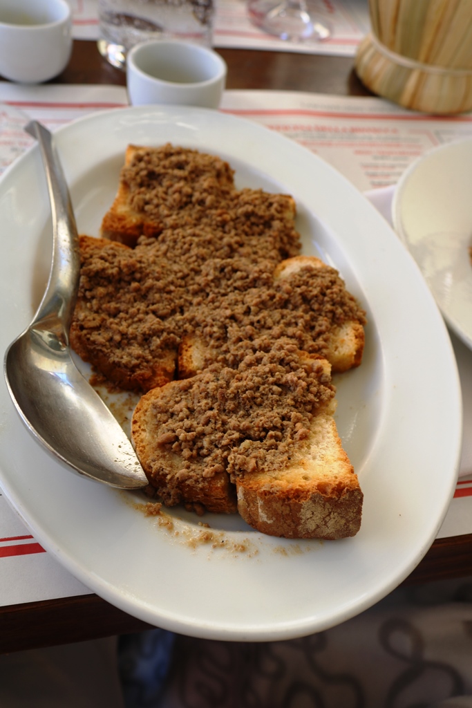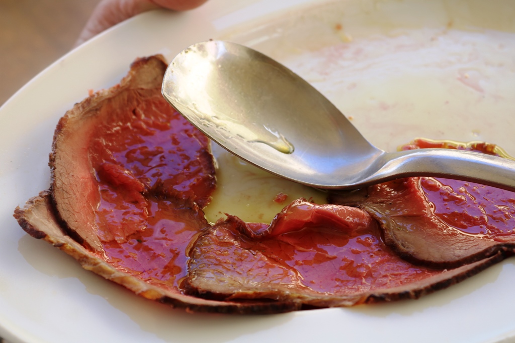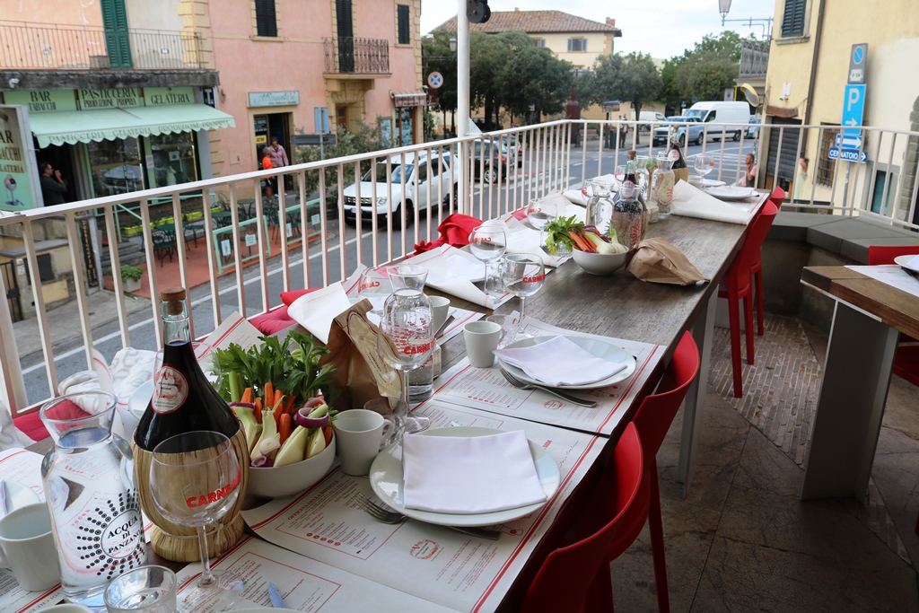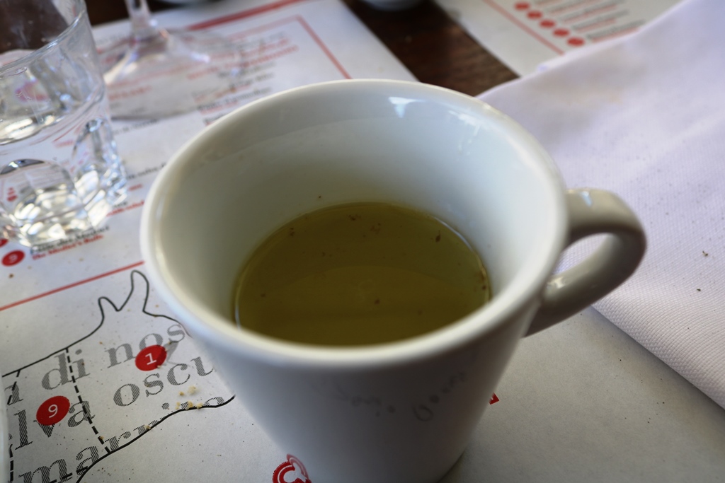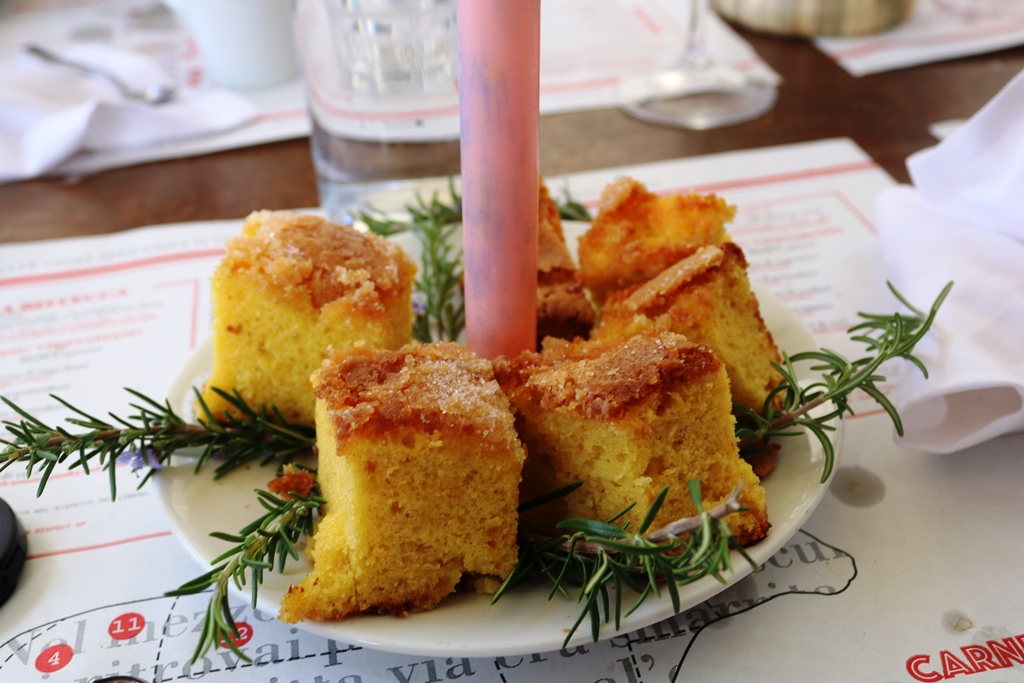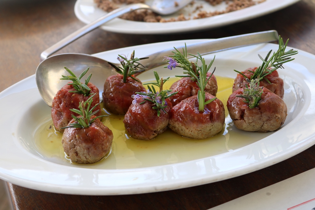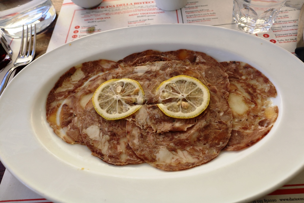 בשעה אחת נכנסנו והתיישבנו בשולחנות ארוכים לצד אורחים נוספים, כשהרעיון הוא לחלוק מנות וסיפורים. מכיוון שאנחנו לא בעלי קיבולת מטורפת בחרנו ב-Solociccia (מטבח הקצב) פילוסופיה התואמת את השקפתנו. התפריט קבוע, 6 מנות של טעימות טעימות, בתוספת מיני תוספות. למעט הלחם אין פחמימות על השולחן – רק בשר, ירקות, שמן זית ויין. בתואר המנה עם השם הציורי ביותר זכתה המנה שנקראת בתרגום חופשי "רוזמרין בישבן" ולא, אין המדובר באיבר אקזוטי למאכל, אלא מעין טרטר שעוצב באופן מעורר… השראה? אין ספק שהענין פה הוא החוויה הכוללת, שמחת החיים של המלצרים ודריו עצמו שנכנס לקראת הסוף לפזר חיוכים. האוכל טעים אבל לא נפלנו.