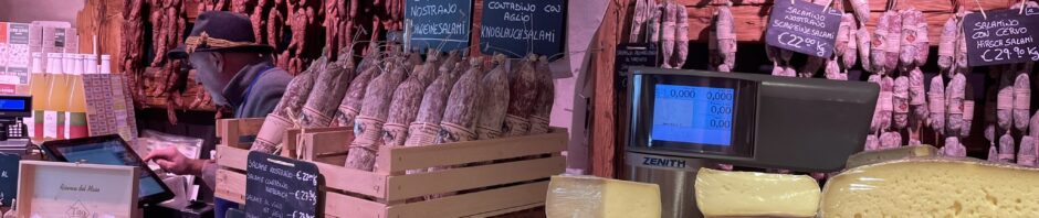 משם נסענו כחצי שעה לעיר Bruneck בה התקשנו מאוד למצוא חניה, מסתבר שבשבת העיירה החמודה שבמרכזה זורם נהר הופכת לעמוסה הן בתיירים והן במקומיים שנוהרים אל השוק המקומי. אבל לנו היה יעד אחר – הסניף של Il Maso dello Speck שהספקנו להגיע אליו לפני שהוא נסגר למנוחת הצהריים. גם המקום הזה מתהדר בתואר מוזיאון, אך הוא יותר בבחינת היכל של כבוד לשימור בשר. רכשנו קבנוס וגם נקניקיות לארוחת הערב, ומגוון נתחים (speck, coppa, fiocco, salami) לקחת איתנו חזרה לארץ.