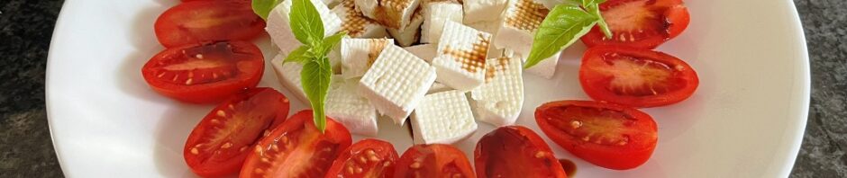 אחרי שעה חתכתי לקוביות, חציתי עגבניות שרי, קטפתי בזיליקום מהגינה (בחודש ינואר! – איפה מכחישי שינוי האקלים) וזלפתי מעל חומץ בלסמי אמיתי שהבאנו ממודנה.