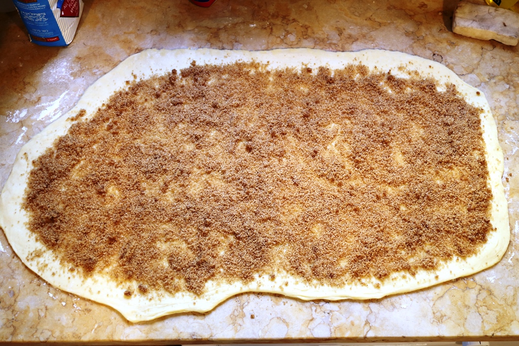 – להפוך את הבצק אל משטח העבודה ולהשתמש במערוך כדי לרדד את הבצק למלבן 28×53 ס"מ
