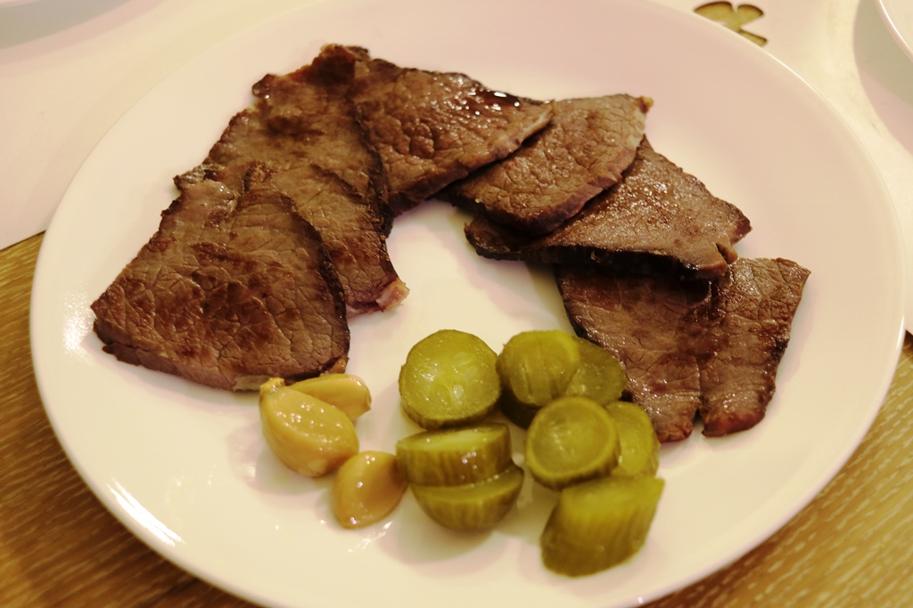 חיממתי מחבת, צרבתי משני הצדדים, פיזרתי מעל טיפה מלח והתיישבנו לאכול בליווי מלפפונים חמוצים ושום קונפי תוצרת בית (87 מעלות, 4 שעות בסו-ויד).