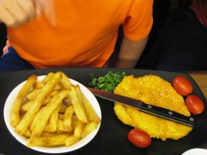 שניצל עם צ'יפס לילד – שניצל פריך ועסיסי מלווה בקערה לא גדולה של, רגע רגע, סוף סוף אחרי אין ספור מסעדות עם צ'יפס תעשייתי דוחה מסוגים שונים, מקום שמקטין את הכמות אבל מספק את האיכות – צ'יפס אמיתי וטעים תוצרת בית