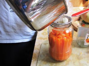 3. מכניסים את מקלות הגזר לצנצנת, שופכים מעל את הנוזלים דרך מסננת.