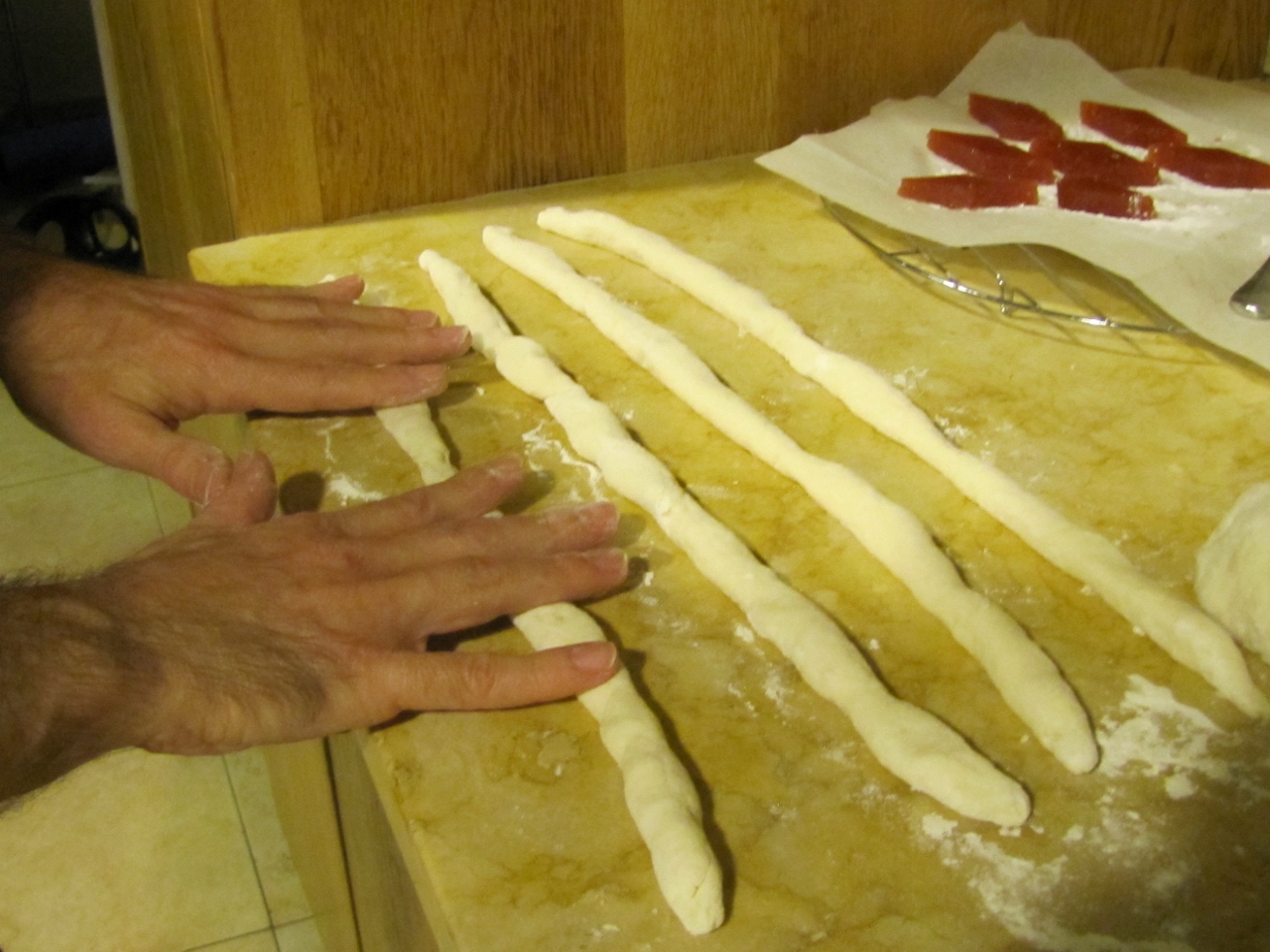 מערבבים את הפירה והקמח עד ליצירת בצק, מגלגלים לגלילים ארוכים וחותכים