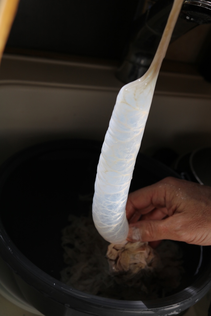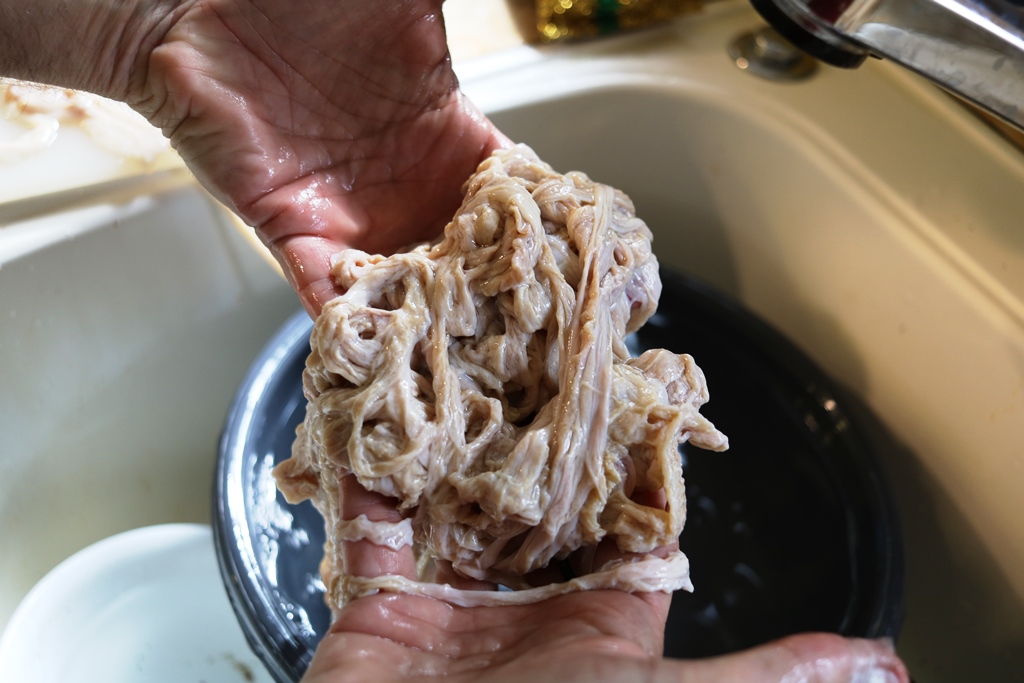 אז פתחתי את החבילה והכנסתי את המעיים לגיגית מים כדי לשטוף החוצה את כל המלח, והיה המון מלח.