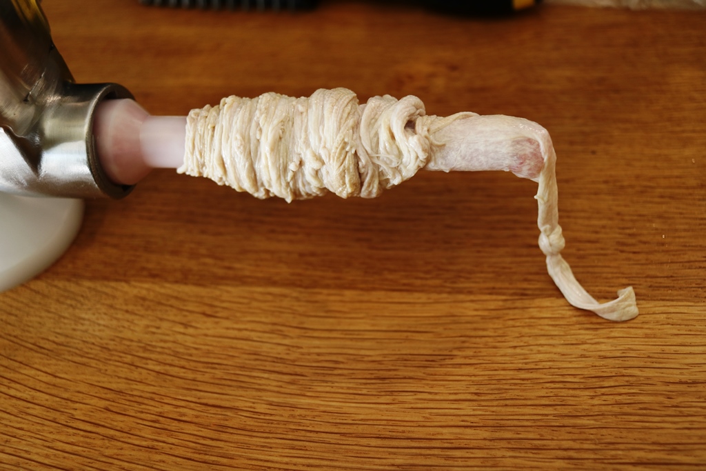 הלבשת המעי על פיית המכונה קצת טריקית אבל מהרגע הזה ואילך חוויית השימוש שונה לגמרי, זה הרבה יותר פשוט, נוח וכיף מאשר שימוש במעי סינתטי. המעיים לא נקרעים, קל להזיז בתוכם את הבשר, קל מאוד לגלגל אותם וליצור לינקים – ממש עולם אחר.