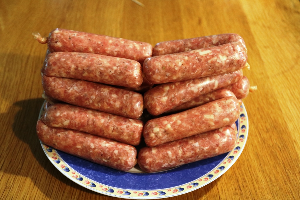כשמגיע הזמן להכין את הנקניקיות, אני מוציא את הבשר להפשרה במקרר. כשהוא עדיין חצי קפוא אני חותך ממנו חתיכות ומבצע טחינה עדינה במכונה בייתית.