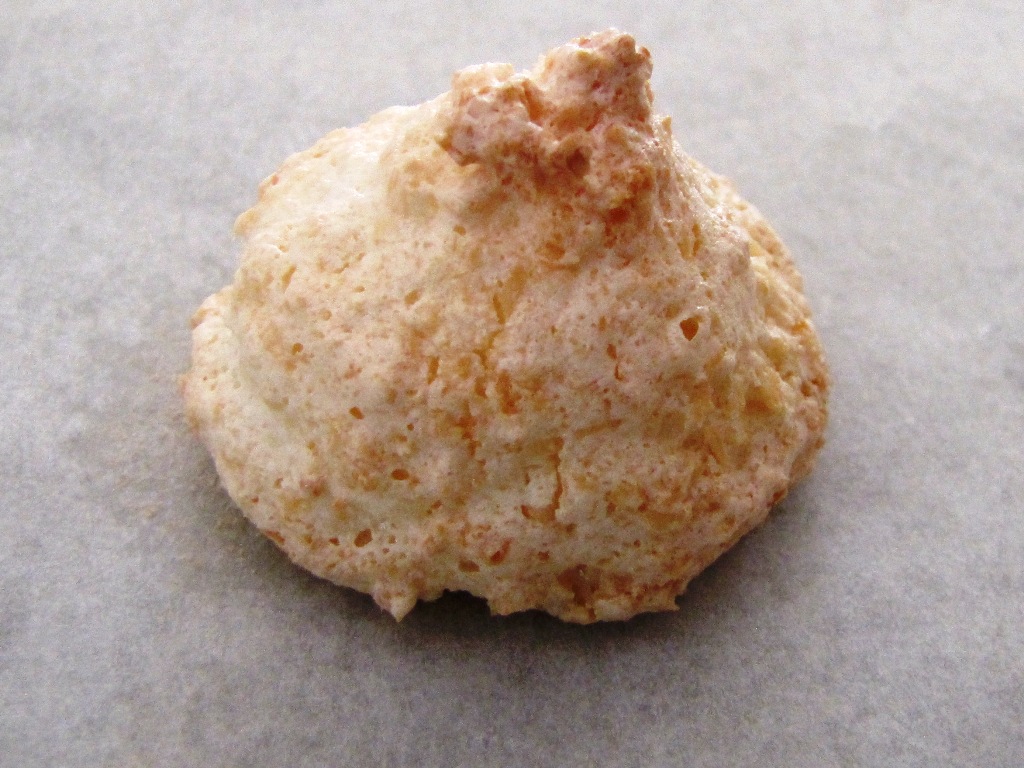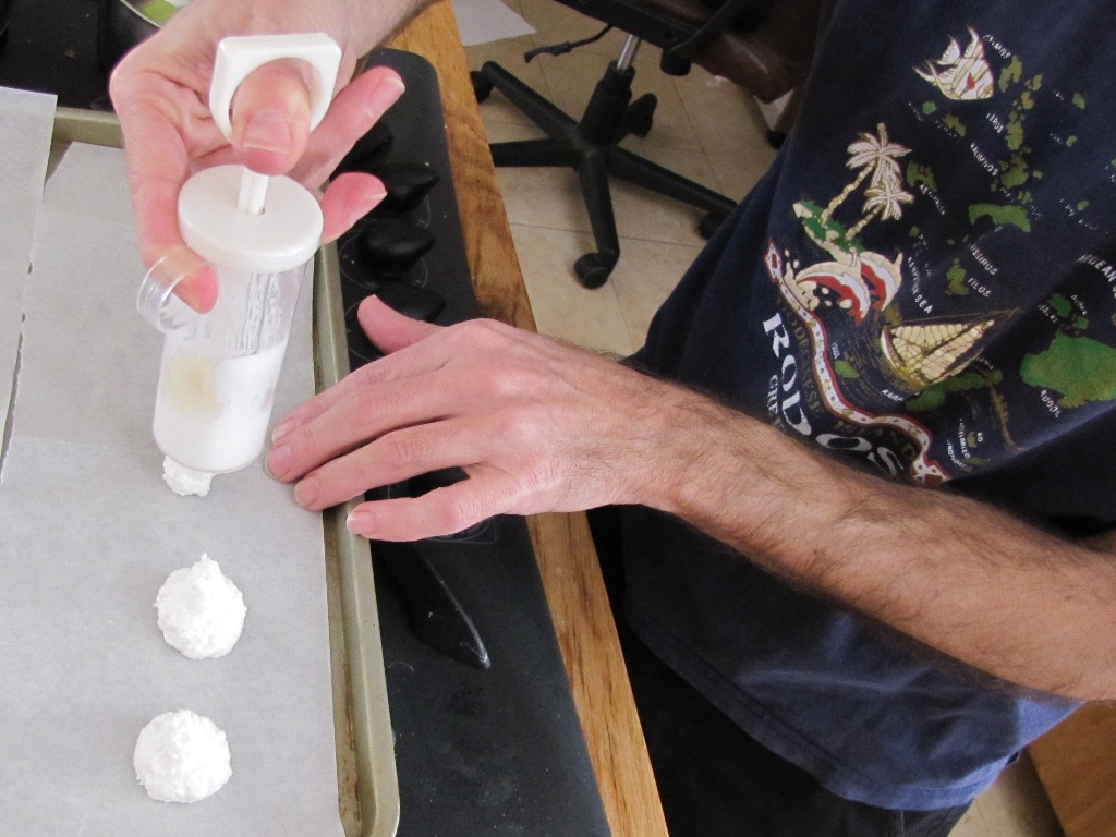 4. להניח בערך כפית גדושה על תבנית משומנת היטב ולאפות 12-15 דקות בתנור שחומם מראש ל-150 מעלות (אם יש שקית זילוף או מזרק עוגיות בעלת פיית כוכב גדולה – עוד יותר טוב)