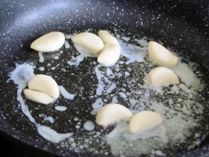 המסתי במחבת 50 גרם חמאה ולתוכה הכנסתי 10 שיני שום קלופות (בפעם הבאה אקצוץ אותן גס)