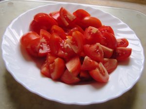 השחמתי אותן לאט (בישול איטי זה טוב) ובינתיים לקחתי 7 עגבניות תמר משובחות וחתכתי כל אחת ל-8.