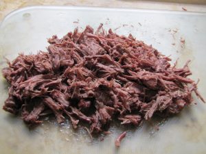 בינתיים פוררתי את הבשר לשערות, העברתי למחבת שנייה, הוספתי את רוטב הבשר מהשקית, קצת מלח ופלפל וחיממתי.