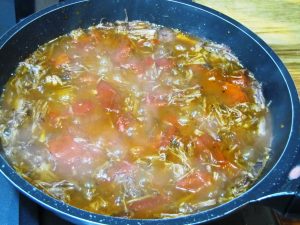 אחרי שכל האלכוהול נשרף, שפכתי פנימה את העגבניות החתוכות, הוספתי בערך 2 כפות סילאן, מלח, פלפל גרוס טרי ופפריקה מעושנת. הגברתי את הלהבה וחיכיתי שיצטמצם.