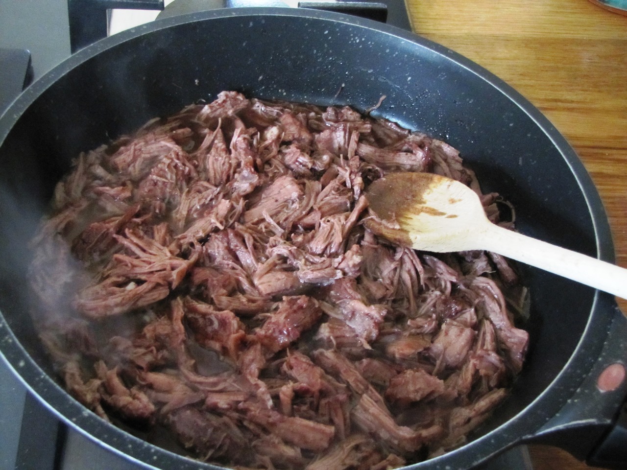 בינתיים פוררתי את הבשר לשערות, העברתי למחבת שנייה, הוספתי את רוטב הבשר מהשקית, קצת מלח ופלפל וחיממתי.