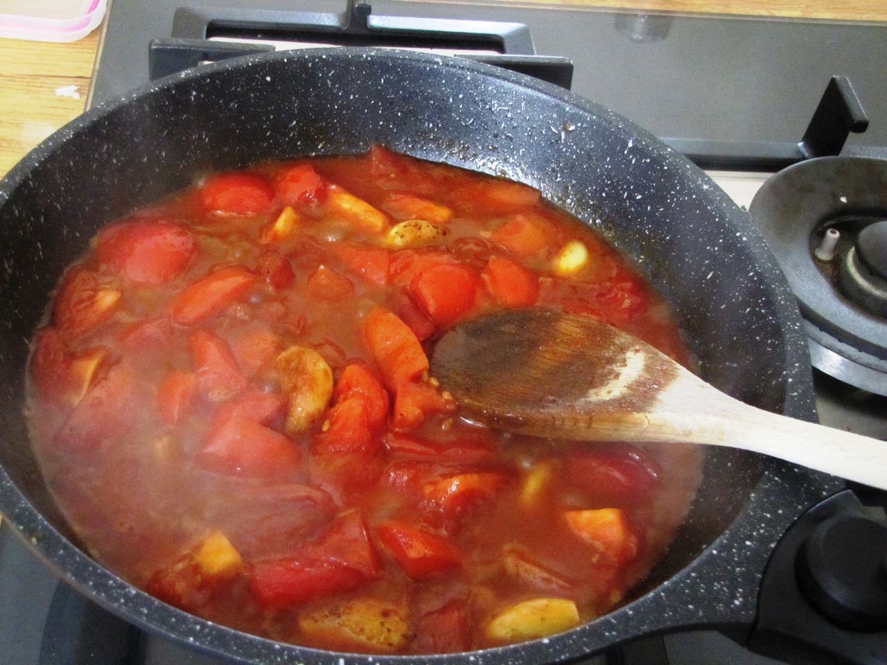 אחרי שכל האלכוהול נשרף, שפכתי פנימה את העגבניות החתוכות, הוספתי בערך 2 כפות סילאן, מלח, פלפל גרוס טרי ופפריקה מעושנת. הגברתי את הלהבה וחיכיתי שיצטמצם.