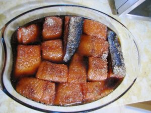 לשטוף ולייבש היטב את חתיכות הדג ולהניח אותם עם העור כלפי מטה בתבנית זכוכית, לכסות בתערובת ולהכניס למקרר ל-8 שעות. בסיום התהליך חתיכות הדג יישחו בכמות גדולה של נוזל חום כהה – זה בסדר גמור :-).