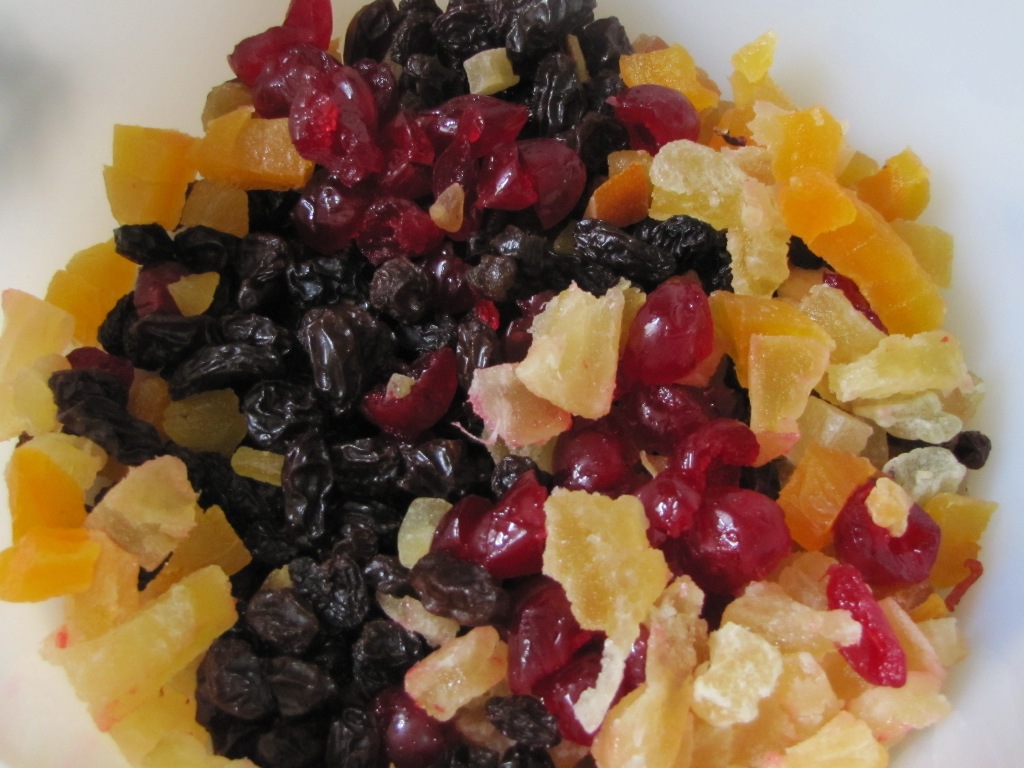 – 300 גרם פירות יבשים הכוללים צימוקים (קחו כהים, הבהירים הם בסה"כ כהים שיובשו עם גופרית), משמשים, דובדבנים, אננס, וכד'