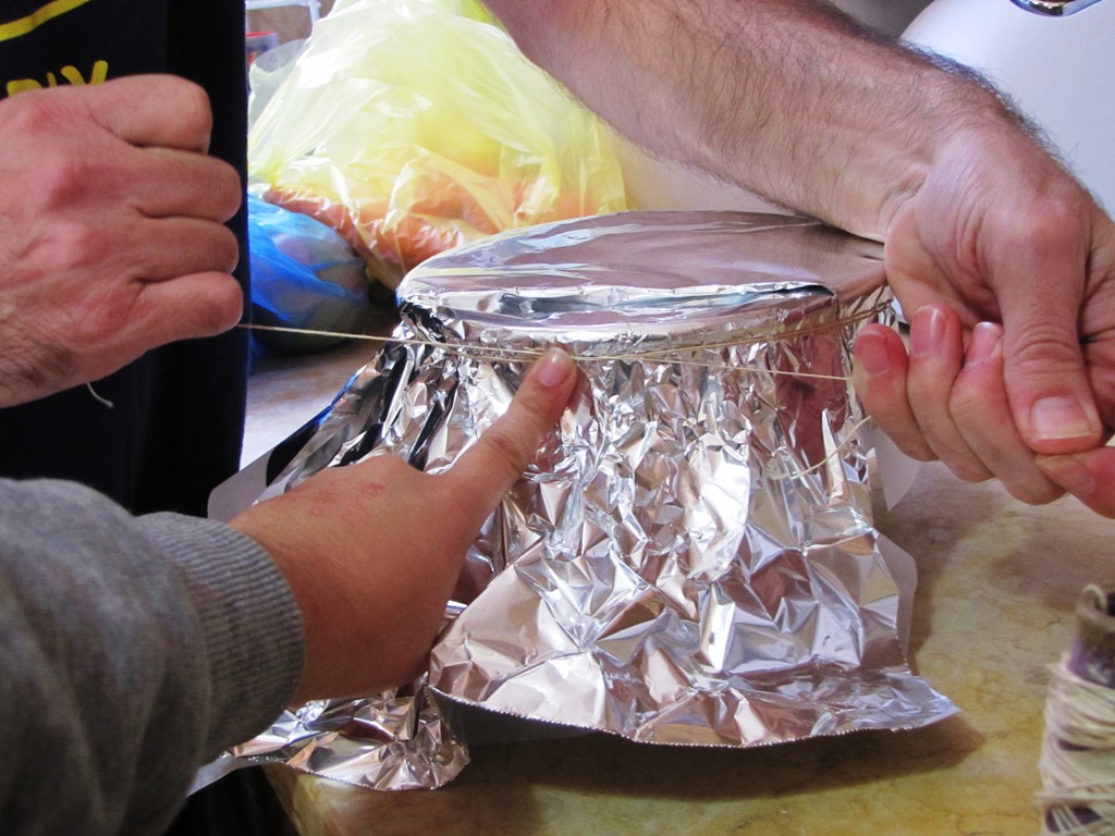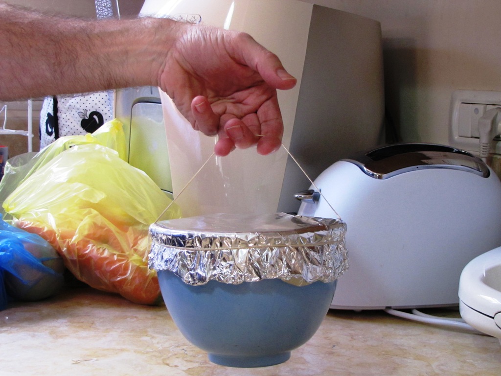 – מניחים דף נייר אפייה על גבי יריעת נייר אלומיניום, יוצרים בהם קפל ברוחב כ-2 ס"מ ומכסים את הקערה כשנייר האלומיניום בחלק החיצוני, מהדקים לדפנות הקערה, קושרים חוט אפייה מסביב לדפנות הקערה, יוצרים קשר מצד אחד לשני ליצירת ידית, וחותכים את שאריות נייר האפייה ונייר האלומיניום – יש אין ספור סרטוני הדרכה באינטרנט 🙂