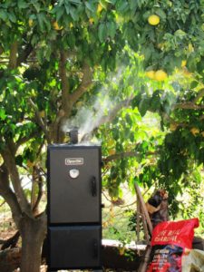 תפריט העישון כלל כרעי עוף – נתח שלא נגעתי בו כמעט מאז הניסיונות הראשונים עם המעשנה הקודמת (שנמכרה בהצלחה בסופ"ש) חזה הודו בשביל הפסטרמה השבועית לסנדוויצ'ים, ועצם שפונדרה אחת שתמשיך את דרכה עטופה בתנור אחרי שעתיים עישון. לקבלת עשן השתמשתי בענף פקאן.