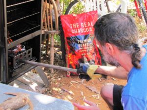 סידרתי יפה 6-7 חתיכות פחם בתוך ארובת ההדלקה, שפכתי קצת שמן בישול מלמעלה, הכנסתי חתיכות של תבניות ביצים וגלילי מגבות נייר מלמטה והדלקתי. שלא כמו פחמי קברצ'ו בלנקו שקשה להדליק אותם, ההדלקה של הפחמים האלה קלה, כמו פחמי הדרים.