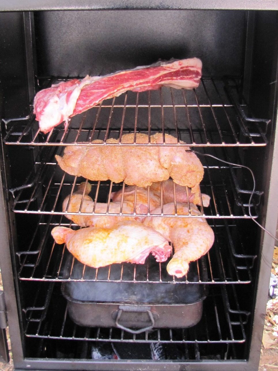 תפריט העישון כלל כרעי עוף – נתח שלא נגעתי בו כמעט מאז הניסיונות הראשונים עם המעשנה הקודמת (שנמכרה בהצלחה בסופ"ש) חזה הודו בשביל הפסטרמה השבועית לסנדוויצ'ים, ועצם שפונדרה אחת שתמשיך את דרכה עטופה בתנור אחרי שעתיים עישון. לקבלת עשן השתמשתי בענף פקאן.