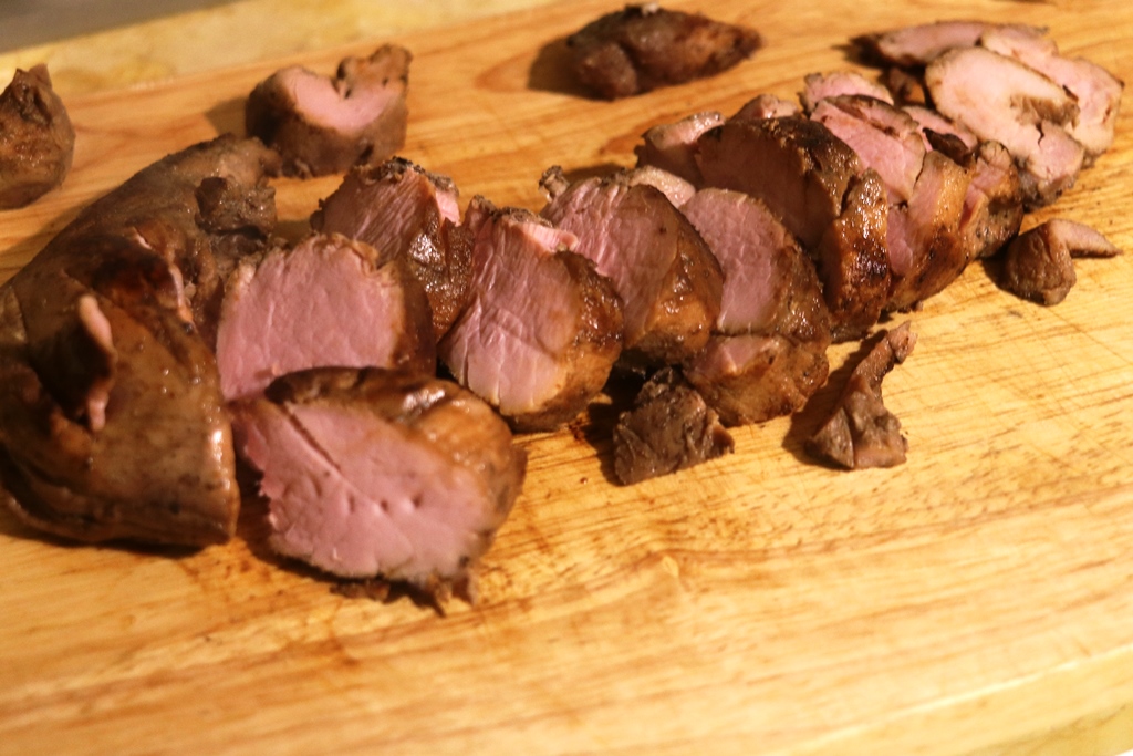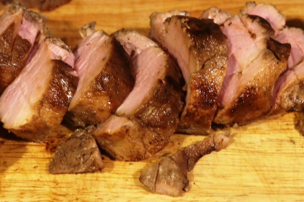 כשרוצים לאכול – מייבשים היטב את הנתחים וצורבים על מחבת לוהטת כ-30 שניות מכל צד – כן, אני יודע שהנתח עגול ובתיאוריה יש לו רק צד אחד.