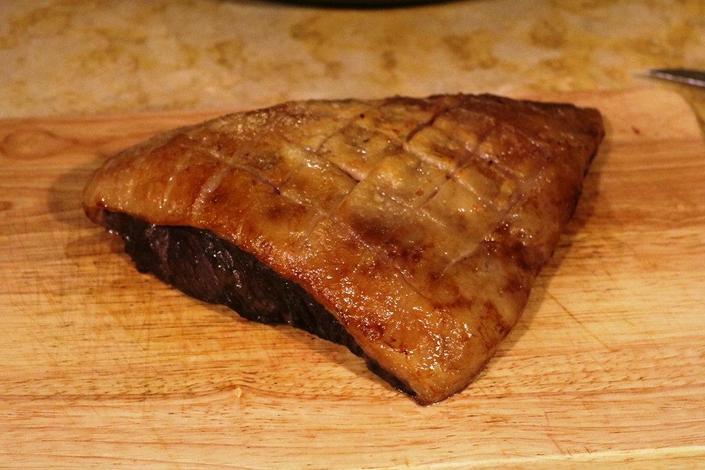 חרצתי את השומן והכנסתי את הנתח מתחת לגריל של התנור לצריבה (בדיעבד אפשר היה לצרוב יותר).