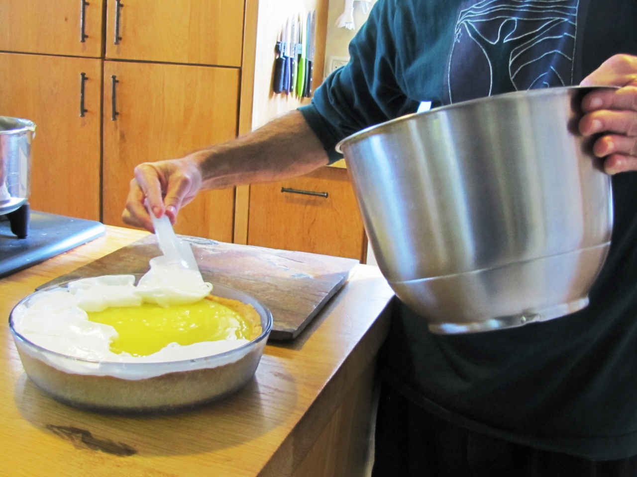 להדביק את המרנג לקצוות הקלתית והתבנית מסביב להיקף ולאחר מכן פנימה לאמצע עד לכיסוי, לייצר גלים עדינים על המרנג (לא לשטח חלק)